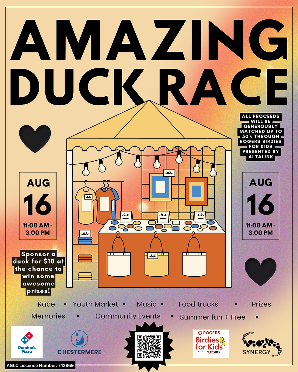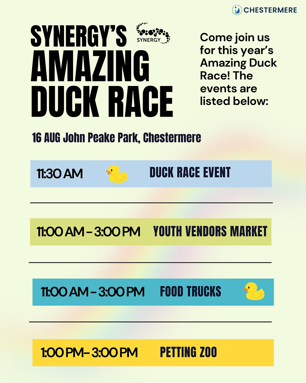 Join Synergy for the annual Duck Race, a beloved summer tradition that brings fun and community spirit to Chestermere. Each year, from July through early August, residents can sponsor rubber ducks for just $10 at local stores, online, or during community events for a chance to win amazing prizes!